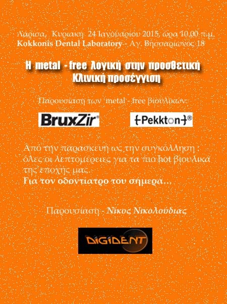 Την Κυριακή 24/01/2016, η Digident σε συνεργασία με το εργαστήριο Kokkonis Dental Lab πραγματοποίησε παρουσίαση για οδοντιάτρους με τίτλο: H metal-free λογική στην προσθετική – Κλινική προσέγγιση.Αναφέρθήκαν όλες οι λεπτομέρειες για τα κορυφαία βιουλικά BruxZir zirkonia και peek.